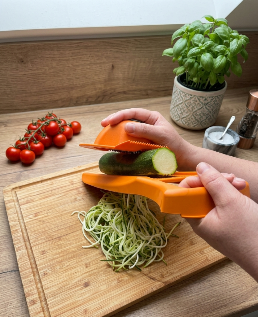 Kluczem do sukcesu nie są przyprawy, lecz technika cięcia. Tarka Roko Borner nie gniecie warzyw – ona je precyzyjnie przecina, zachowując chrupkość i zamykając soki wewnątrz każdej nitki. Co więcej, tworzy słupki o idealnie równej grubości, co gwarantuje równomierne, ekspresowe gotowanie. Ta profesjonalna koreańska tarka do warzyw sprawi, że zapomnisz o szukaniu końcówek makaronu w wodzie!