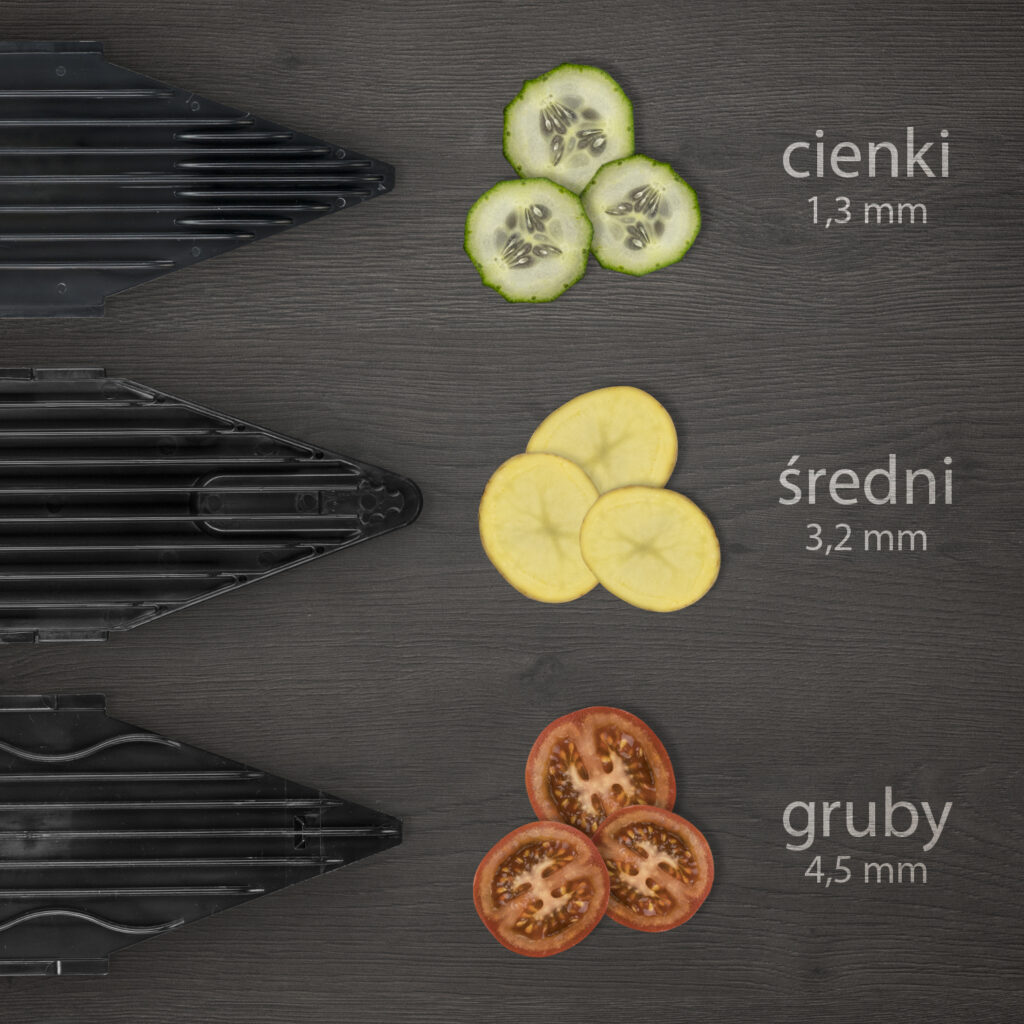 - Dwustronna wkładka do szatkowania i cięcia w plasterki (1,3 mm i 4,5 mm)