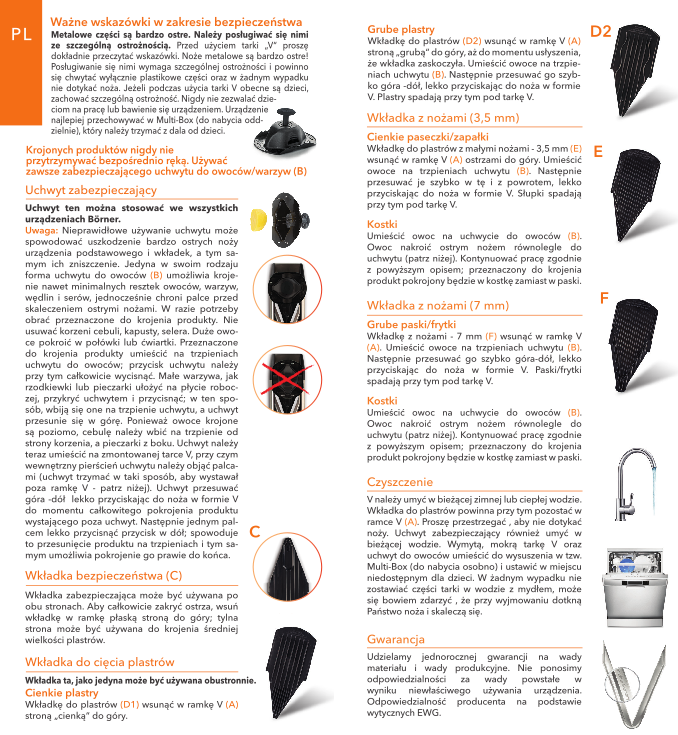 Dzięki opatentowanej technologii oraz wysokiej jakości stali, noże wszystkich modeli V-Hebli pozostają niezwykle ostre przez cały okres użytkowania.Pamiętaj – szatkownicę myjemy pod letnią bieżącą wodą nigdy w zmywarce. Szatkownica V6 Borner to klucz do szybkiego, precyzyjnego i bezpiecznego krojenia warzyw i owoców. Wybierz jakość, wybierz innowacyjność, wybierz Szatkownicę V6 Borner dla doskonałych efektów w Twojej kuchni!